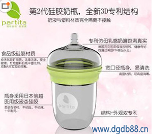 硅膠是一種材料,是一種能讓歐美等國家非常喜愛的材料,因為越來越多的產品開始選擇用這樣的材料開始生產,比如說硅膠奶瓶;硅膠奶嘴;圍兜等,最近就有一款新上市的奶瓶“partita” 這款產品是純硅膠打造,瓶身是高透明硅膠材質,瓶蓋和奶頭也是硅膠透明材質,從上倒下,看起來更像是一個可愛的寶寶,既然是高透明的硅膠生產,那么產品100%是過食品級FDA認證,不管是經過多少度的高溫開水,都不會釋放出有害物質,這款硅膠奶瓶是由加拿大布迪家居開發生產。從硅膠本身的特性來說,硅膠是一種無色;無味;無毒的天然合成物質。