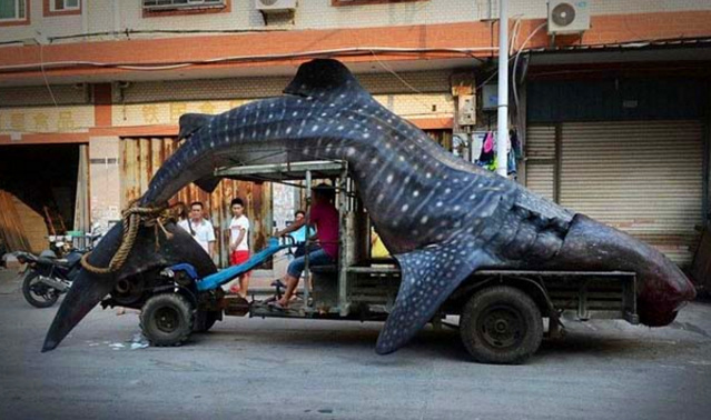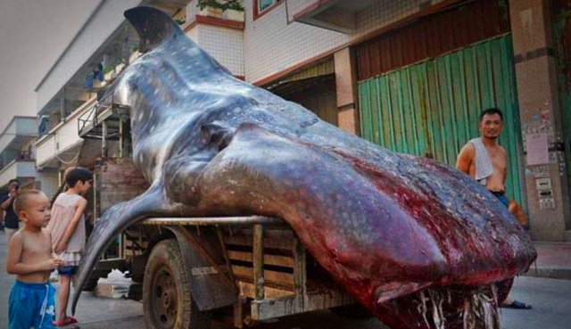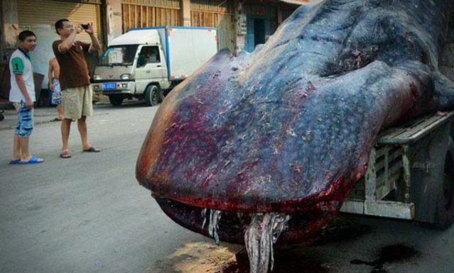 隨著拍攝者的鏡頭和圖片你可以看到這個龐然大物明顯是一個深海里的動物,走近才發現原材料是一頭鯨魚,這個大個兒被放在車上,嘴巴裸露著鮮血,明顯能感覺得出已經死了。
